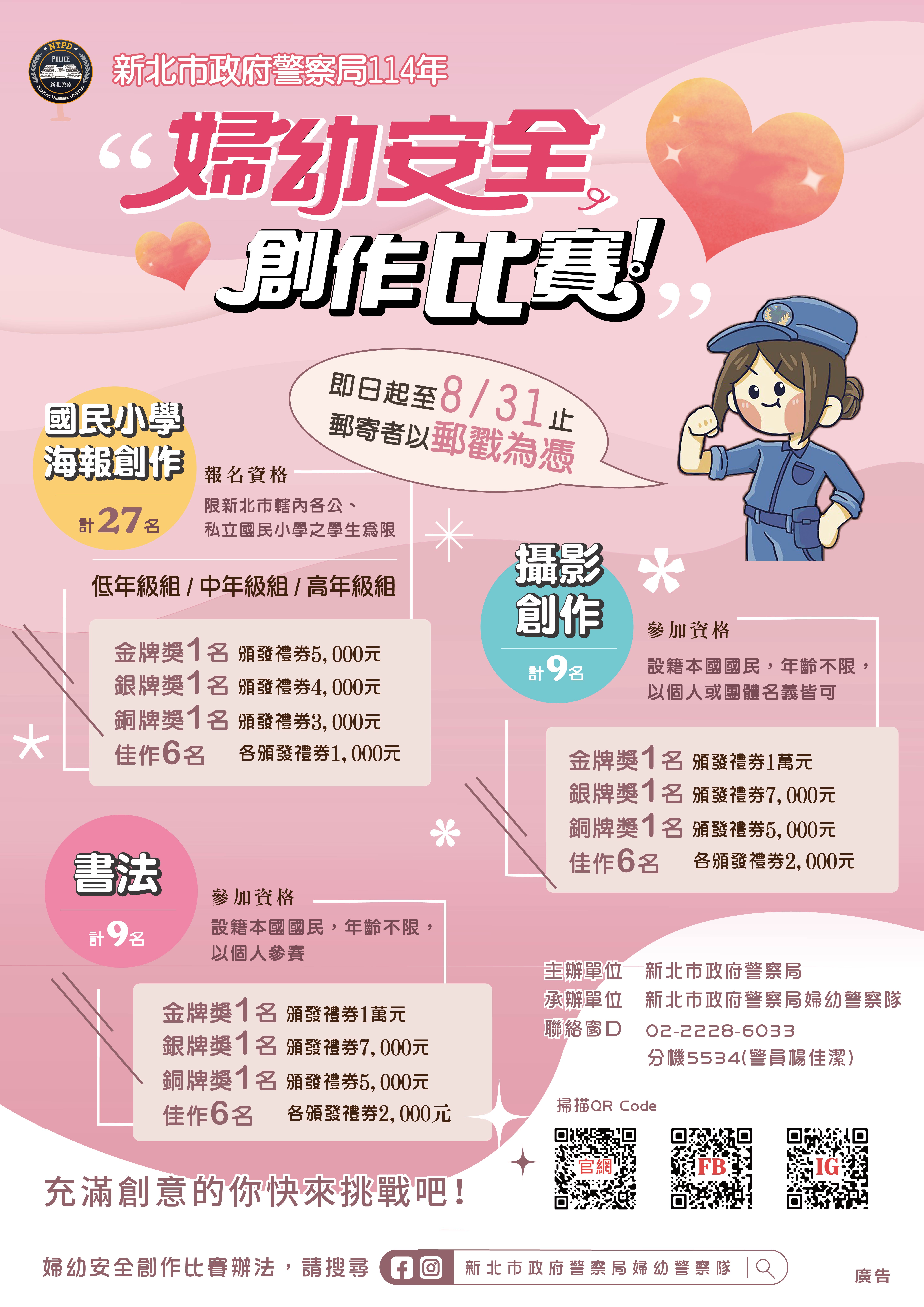 新北市政府警察局114年婦幼安全「國小海報創作」、「攝影創作」及「書法創作」比賽開跑囉! 透過創意發揮,啟發孩童對於婦幼安全觀念且獎品豐厚,熱愛創作的你還在等什麼呢?比賽報名自即日起至114年8月31日止(以郵戳為憑)。